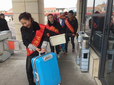 ?xml:namespace>。志愿者們身披綬帶深入各大站點(diǎn)、車場(chǎng),開(kāi)展站臺(tái)咨詢,導(dǎo)乘服務(wù),主動(dòng)扶老攜幼,為乘客兌換零錢,共發(fā)放乘車指南1000余份,深受乘客歡迎。圖為賈汪公司志愿者在幫助江蘇安全技術(shù)職業(yè)學(xué)院開(kāi)學(xué)返校的學(xué)生運(yùn)送行李。