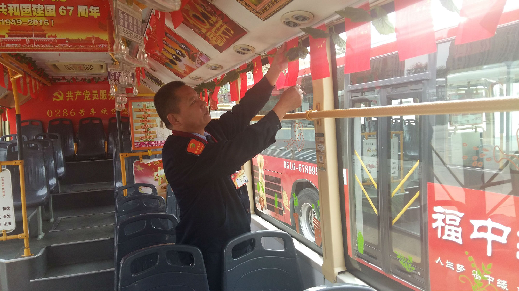 公交駕駛工作平凡、枯燥,但曹瑞國愛動腦、喜創(chuàng)新,總會給乘客不一樣的驚喜,感受不一樣的出行服務。適逢節(jié)日、活動,他總會換著花樣地自掏腰包,給車上乘客一個驚喜:春節(jié),購置小紅燈籠掛滿整個車廂,給乘客帶來濃濃的年味;母親節(jié),他準備了100支康乃馨、祝福卡,送給“媽媽級”女乘客,道上一聲由衷的問候;今年七一,為慶祝建黨95周年,他準備了95面黨旗,95本黨章,以及黨徽、紀念章給乘客,并在車廂廣播入黨宣言、革命紅歌;9月22日宣傳世界無車日,他制作了10個卡通宣傳牌,加班安裝在車廂四周,號召市民選用綠色交通工具出行,減少城市污染;十一,他將一百面國旗掛在車廂內(nèi),被媒體稱為“國旗哥”;10月9日重陽節(jié),為老年乘客發(fā)放免費鞋墊……