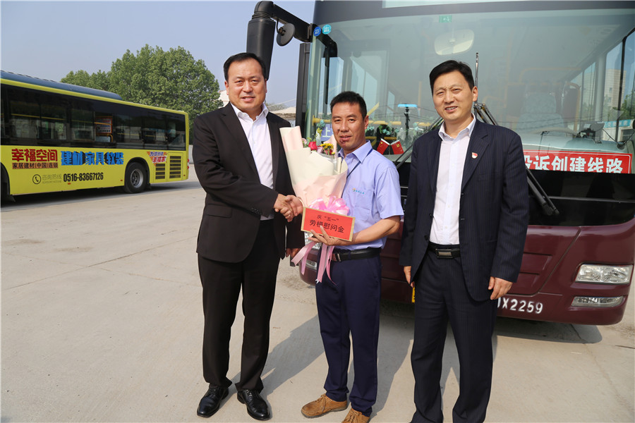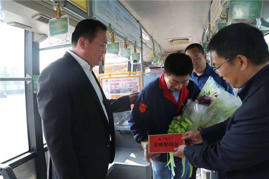 杜紅軍一行首先來(lái)到韓山終點(diǎn)站,剛行駛完一趟的市勞模、49路線駕駛員王博正利用休停時(shí)間打掃車輛,杜總走上前親切地與王博握手,并把一束嬌艷芬芳的鮮花和勞模慰問(wèn)金送到他手中。